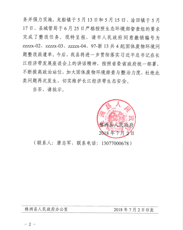 关于同意固体废物环境问题销号的请示 株洲县政府门户网站 www.jnjejd.com更新时间:2018-07-04作者:字体[ 大 中 小 ]